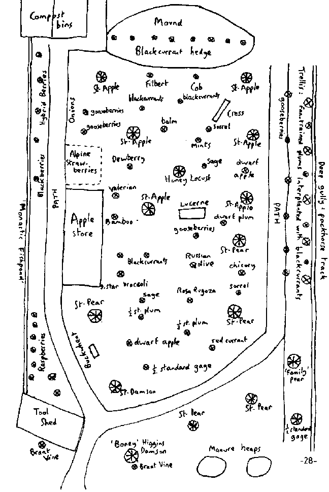 A plan of Robert Hart�s original Forest Garden area. From �The Forest Garden�, published by Institute For Social Inventions (6 Blackstock Mews, Blackstock Road, London N4 2BT, UK)