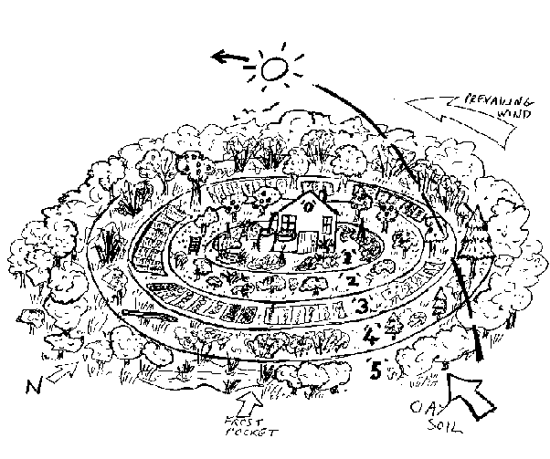 Zoning is about correct placement- positioning things in ways that are the most appropriate; Zones are numbered from 0 to 5, and can be thought of as a series of concentric rings moving out from a centre point, where human activity and need for attention is most concentrated, to where there is no need for intervention at all...