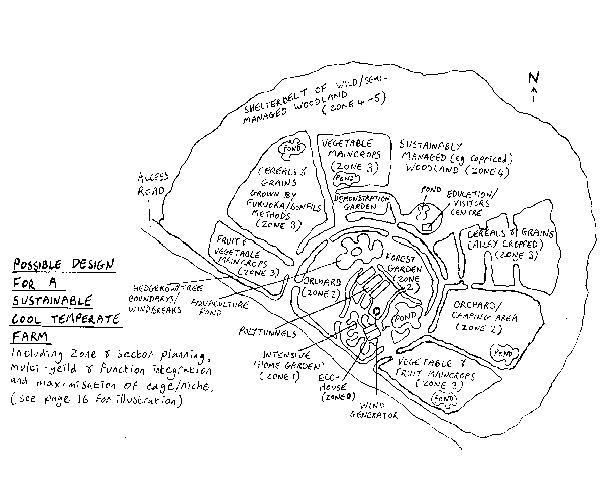 The farm layout depicted illustrates zonal placement, wherein those areas that require regular attention, such as the polytunnels and home garden where produce is picked on a continuous basis are placed closest to the house (Zone 1), through to orchards and forest garden areas (Zone 2) and maincropping areas for grain, fruit and vegetable production for trading (Zone 3), out to coppiced woodland areas that require seasonal attention only (Zone 4-5)... The �keyhole� design creates a south facing sheltered sun trap effect, whilst surrounding the site with trees acts as a windbreak. This is further enhanced by planting mixed hedgerows as boundaries between growing areas, which also provides wildlife habitats, increases biodiversity and additional yields such as wild fruit and nuts, mulch material and includes nitrogen fixing species to further increase fertility... Where this farm design also differs from many contemporary agricultural models is it�s diversity of yields. Outputs include fruit and vegetables, cereal and grain crops and timber and coppice. Whilst the cash value of each of these crops is unlikely to be as great were any of these grown as a monocrop, the diversity of yields actually greatly increases the land�s overall output. Other �value added� products might include shitake mushrooms grown on logs, �country� wines, rustic furniture, hurdles, charcoal, poles, honey, propogated unusual edible plants for sale or bottled comfrey and nettle liquid feed. Most produce is traded from the site or through local outlets including via box schemes and farmers markets. An education/visitors centre provides a venue for courses and school visits, etc, thus further value is added in terms of being a community resource... The site is also designed to be as self reliant as possible, thus minimising the need to import energy or fertility from outside. Wind energy is harvested, whilst solar energy is captured directly via photo-voltaic panels on the roof of structures, or indirectly via the bio-mass of the trees and woodland which can then be used as fuel. Water too is harvested and cycled as efficiently as possible, with collection and storage ponds doubling as wildlife havens (and pest control) and aquacultures. Grey water from the dwellings is used to irrigate fruit and bush crops, whilst compost toilets return otherwise wasted fertility to the soil.