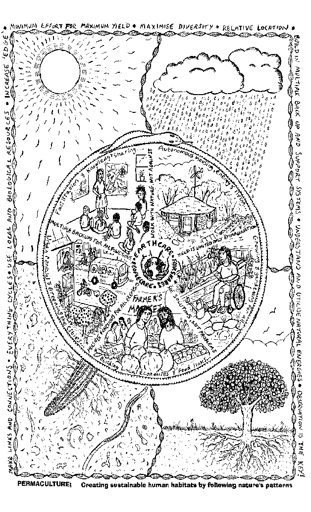 �PERMACULTURE� is a word that was originally coined in the mid seventies by two Australians, David Holmgren and Bill Mollison, to describe the design system pioneered as a response to what they, and many others globally, saw as serious challenges to the survival of all of us. Originally derived from the words �PERMAnent agriCULTURE�, permaculture has gone beyond it�s roots in looking at strategies to create sustainable food growing methods to become a worldwide movement encompassing all aspects of how we as human beings can live harmoniously in relation to our Earth and it�s finite resources- A PERManent CULTURE. Permaculture now probably has as many defintions as there are practitioners, but one that is particularly useful might be-