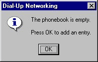 After Dial-up Networking is installed you will be presented with a warning that the phone book is empty, as shown below.