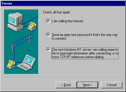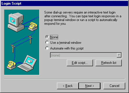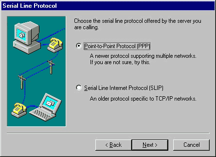 5. This screen allows you to specify the type of protocol to use with this connection, you should check the Point-to-Point Protocol (PPP) radio button as we do not support the SLIP protocol. Click Next, this will bring up the screen shown below.