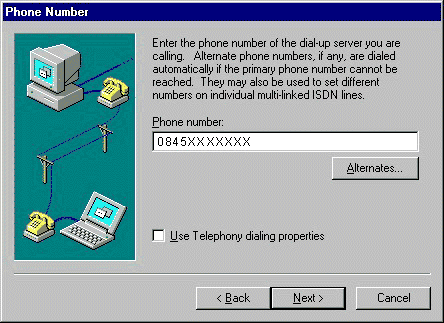 4. In this screen you should enter the phone number you need to dial to connect to us. Click Next, this will take you to the following stage of the wizard.