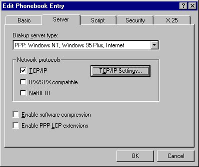 11. After you have selected the Edit entry and modem properties option you will be presented with a screen on which you should click the tab that says SERVER as shown below.