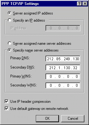 13. When you open the PPP settings screen there will only be a single DNS server address in there - you should manually add the DNS Addresses of 212.85.249.130 and 212.1.130.32 as shown in the screenshot above. You then click the OK button until you are back to the screen where it says Dial at the bottom of the window. When you are back to this screen click DIAL, this will bring up the following screen.