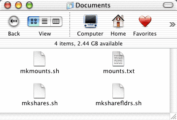 NetInfo mounts allow OS X clients to automatically mount a share-point as part of the clients' file system during user log in (Usually in /Network/Servers). This allows users to access afp-served files from a client machine without being presented with a log-in window. If you are auto-mounting share points that reside on a Mac OS X machine, then you can use scripts as described below, to create the share points and appropriate folders. You should run these scripts on every machine that you defined in the "mounts.txt" file. First, copy the script "mkshares.sh" into roots' home directory (/private/var/root/Documents). |