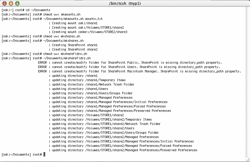 Now that the SharePoints are defined, we need to make sure that all the folders required by the SharePoint are available. Copy the script "mksharefldrs.sh" into roots' home directory (/private/var/root/Documents). |