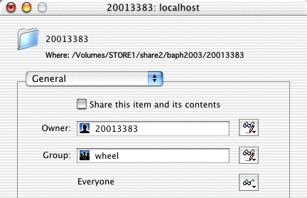 Open a group folder and create a new folder. Rename this new folder to the users short name. Note, placing user homes within a group folder allows you to administer these directories more easily. In the example opposite, the home directory for the new user has been placed within a folder called "baph2003". This folder contains user homes for all BA Photography students who graduate in the year 2003. As an administrator, I know that in Summer 2003 these user homes can be deleted. |
