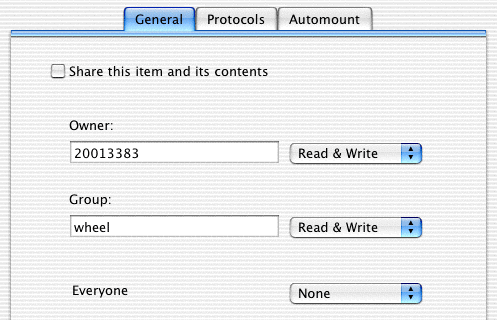 Finally, set the permissions on the "Documents" folder. Set the "Owner" to the user that you just created with read/write access. Set the "Group" to "wheel" with read/write access Give "Everyone" NO access Click on the "Save" button to make changes. |