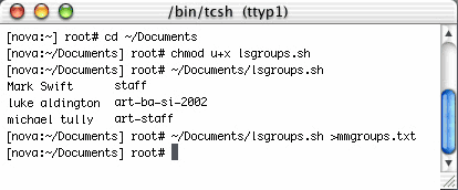 Execute the "lsgroups.sh" script again, but this time redirect the output to a file by typing the following: