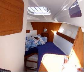 | The keel box has teak inspection hatches, the galley has reverted to teak. The step below is moveable & removable, & may well have a duplicate piece in further boats, to form a small easily stowed table/galley work surface. I would have liked to have seen a foldaway/hinged keel handle, for that was the only obstruction for my 65" frame, below. All four berths would comfortably accommodate me. The forepeak, as well as the shelving, also has a small locker, forard. | |