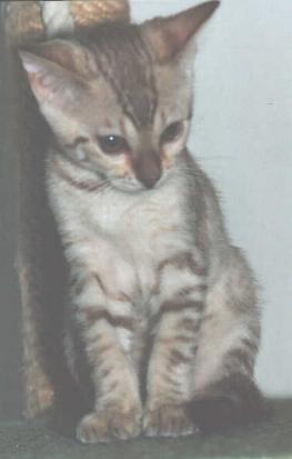 Voted: (jointly) 'Cat I would most like to take home' at the 1996 Bengal Seminar, by breeders and judges, six year old 'Jaro' is now our resident Snow Bengal stud. He has thick dense leopard-like fur with loads of pearl glitter. The winner of four merits at four consecutive shows, and is the father of beautiful kittens, both brown spotted and snow.