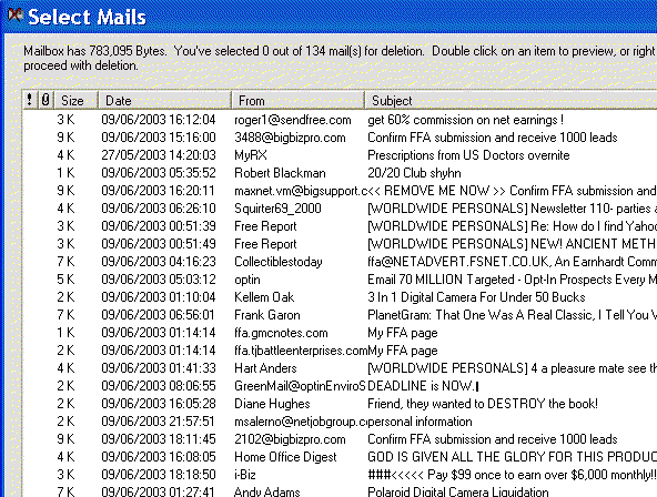 E-MAIL REMOVE You can use this superb piece of software for multiple POP server accounts. Before you let unwanted emails into your inbox, just check the server first and this screen shot shows you whats waiting for you. You simply highlight what you don't want and they are deleted.