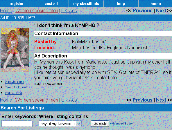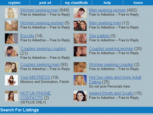 The classifieds system on the left covers UK Adults. The other sites are very similar PLUS ! ... 100's of private advertiser pages with picture sets, email addresses and telephone numbers from around the UK |